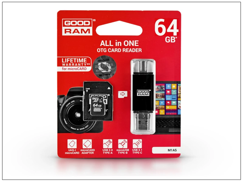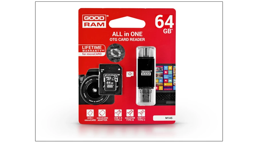 A GOODRAM M1A5 (All-in-One) egy valóban univerzális tárolóeszköz, amely 5 különböző csatlakozási felületet tartalmaz. Az M1A5 három USB csatlakozót (USB 2.0, micro-USB, Type-C 3.0 ) és két memóriakártya szabványt (szabvány és microSD kártya) ötvözi a maximális rugalmasság és kompatibilitás érdekében számos eszközzel.