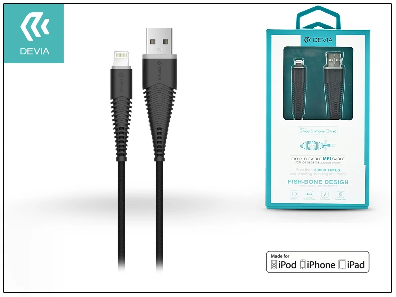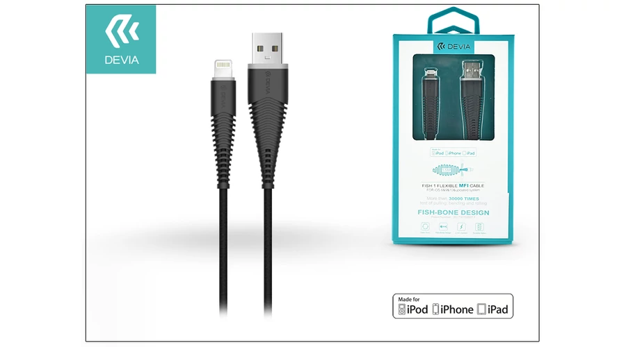 Apple iPhone 5/5S/5C/SE/iPad 4/iPad Mini USB töltő- és adatkábel 1,5 m-es vezetékkel (MFI engedélyes) - Devia Fish1 Flexible Lightning USB 2.4 - black