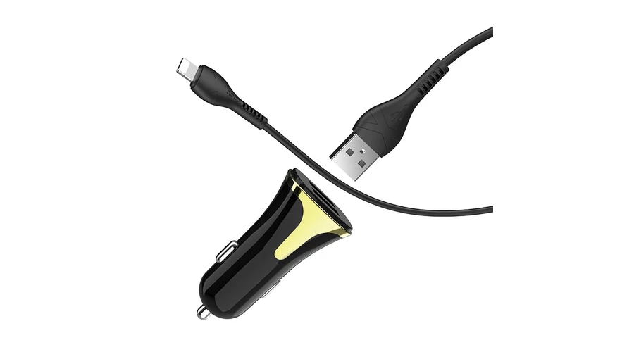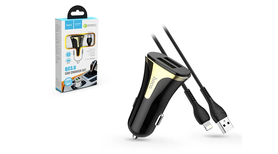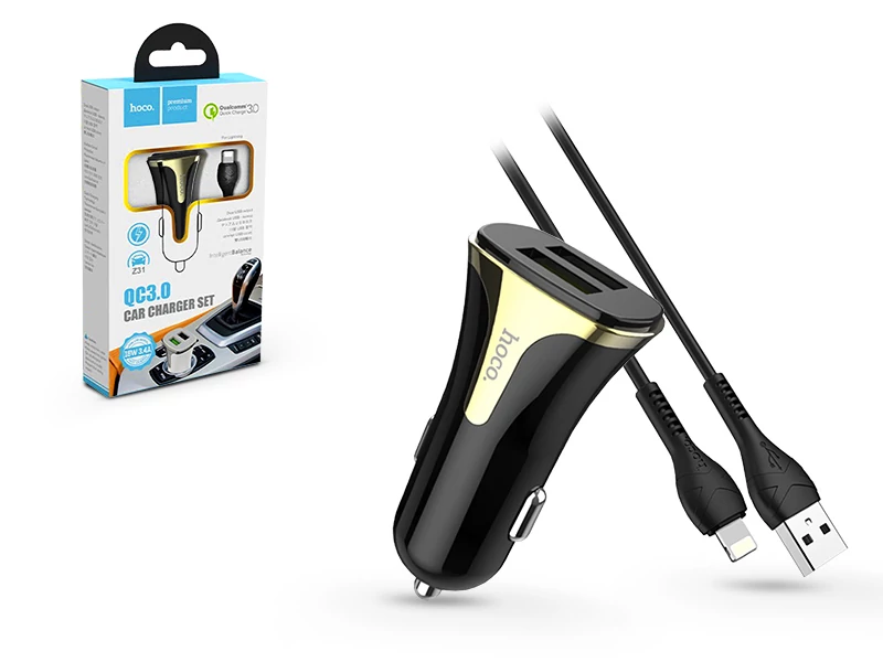 Apple iPhone Lightning szivargyújtós töltő adapter + lightning adatkábel - 5V/3,4A - HOCO Z31 QC3.0 - fekete