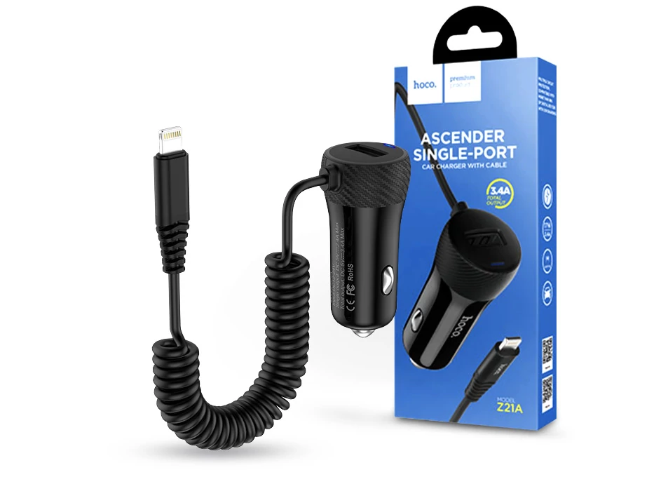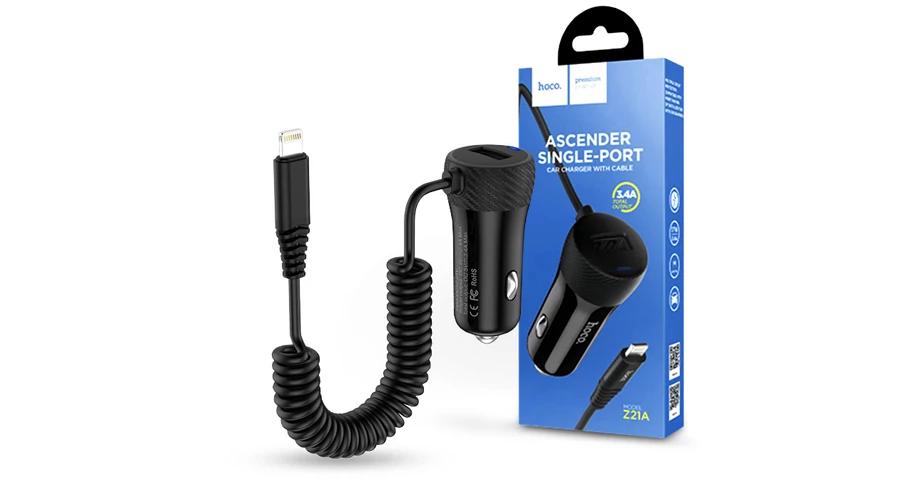 - HOCO Z21A Ascender egy USB portos autós töltő beépített Lightning kábellel