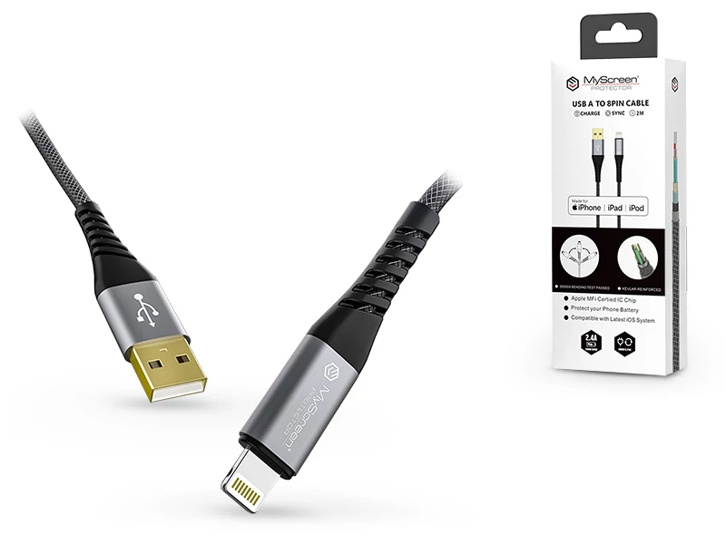 Apple iPhone Lightning USB töltő- és adatkábel 2 m-es vezetékkel (Apple MFI eng.) - 2.4A - MyScreen Protector Kevlar Lightning - black/grey