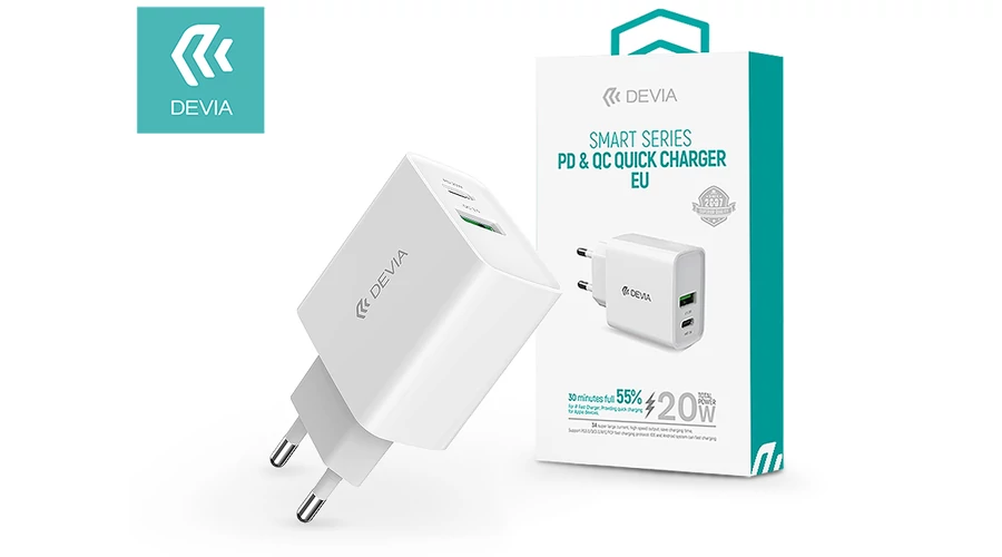 Devia hálózati töltő adapter Type-C + USB bemenettel - 20W - Devia Smart Series PD3.0 + QC3.0 - Qualcomm Quick Charge 3.0 - white