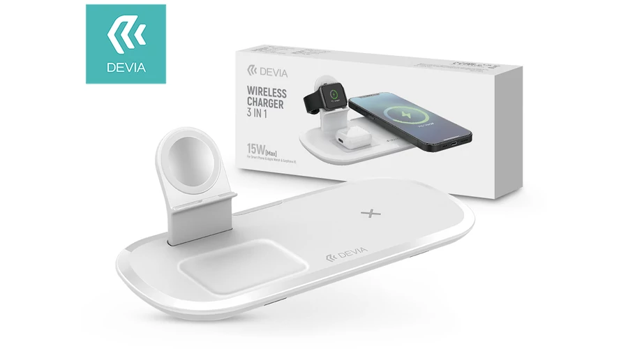| Devia Qi univerzális vezeték nélküli töltő állomás - 15W - Devia V.5 3in1 Wireless Charger for Smartphone + Apple Watch + Earphone - white | |