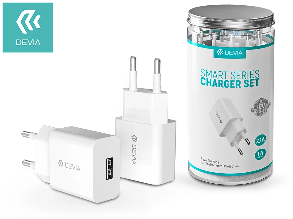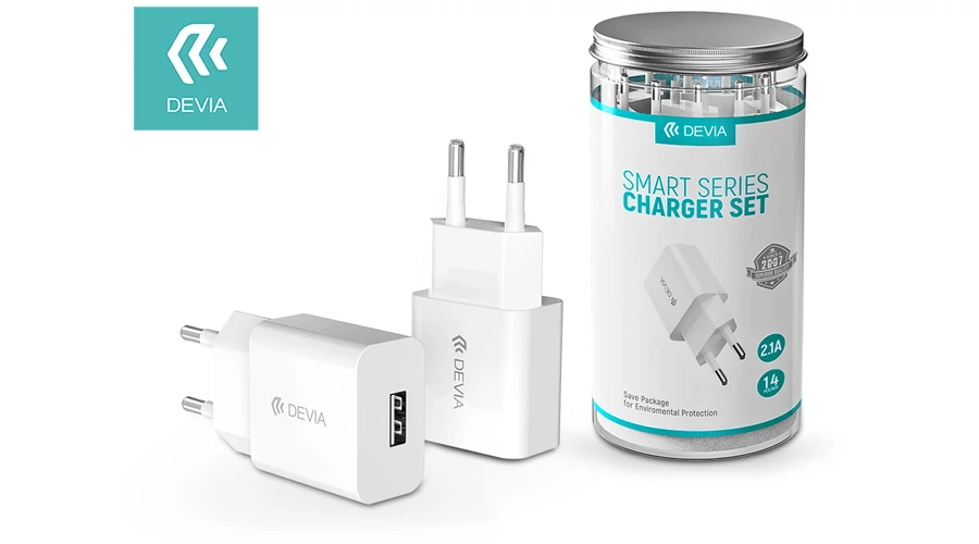Devia Smart USB hálózati töltő adapter - Devia Smart USB Fast Charger Set - 5V/2,1A - 14 db/csomag - white