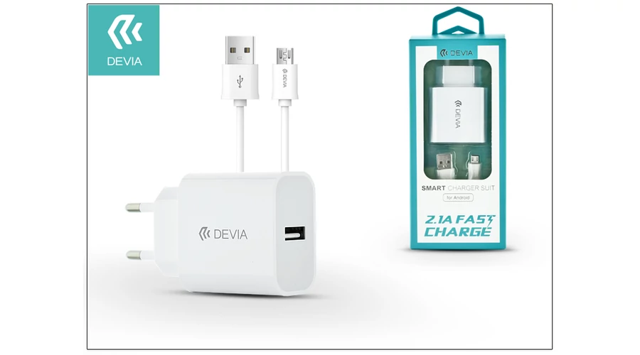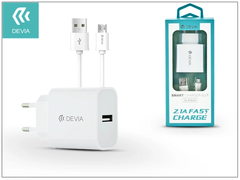 Devia Smart USB hálózati töltő adapter + micro USB kábel 1 m-es vezetékkel - Devia Smart USB Fast Charge for Android - 5V/2,1A - white