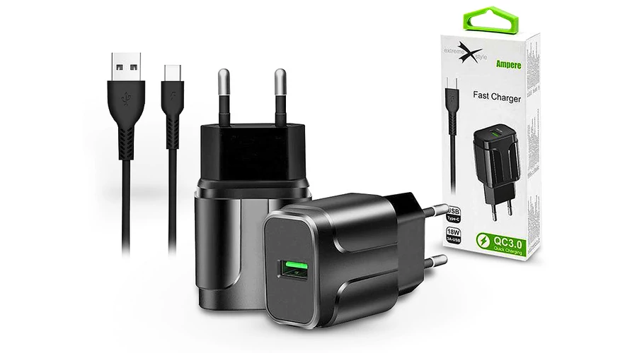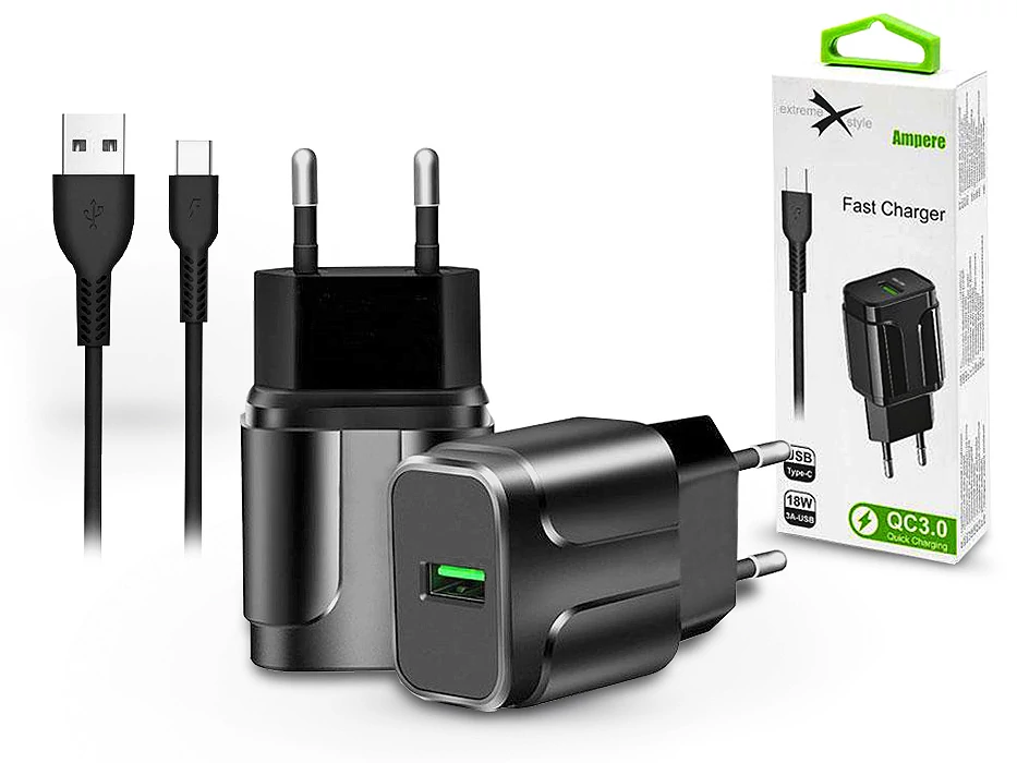 Extreme hálózati töltő adapter + Type-C adat- és töltőkábel - 5V/3A - Extreme LAD0276 QC3.0 - fekete