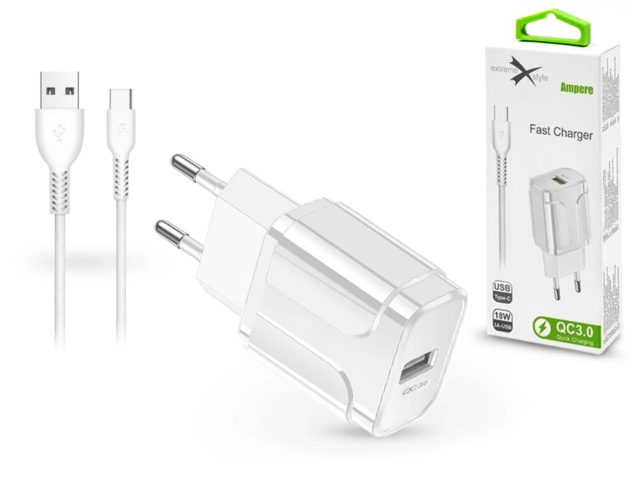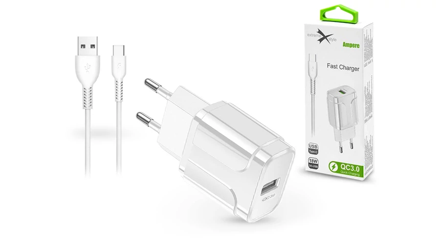 Extreme hálózati töltő adapter + Type-C adat- és töltőkábel - 5V/3A - Extreme LAD0277QC3.0 - fehér
