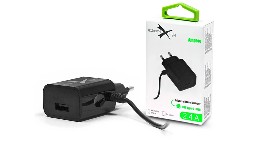 | Extreme hálózati töltő Type-C kábellel + USB csatlakozóval - 5V/2.4A - Extreme LAD0242 - fekete | |