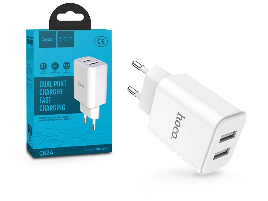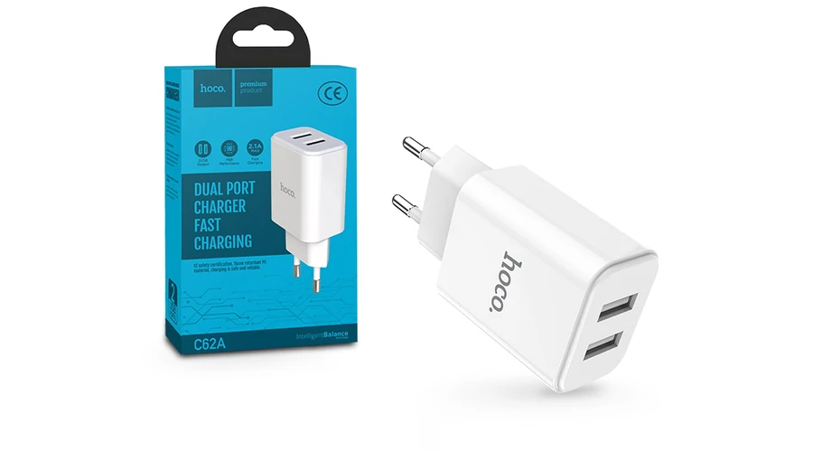 HOCO 2xUSB hálózati töltő adapter - 5V/2.1A - HOCO C62A Dual Port Charger - fehér
