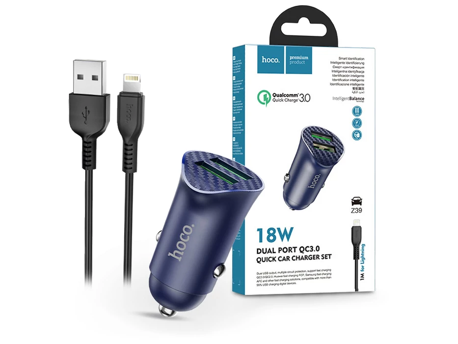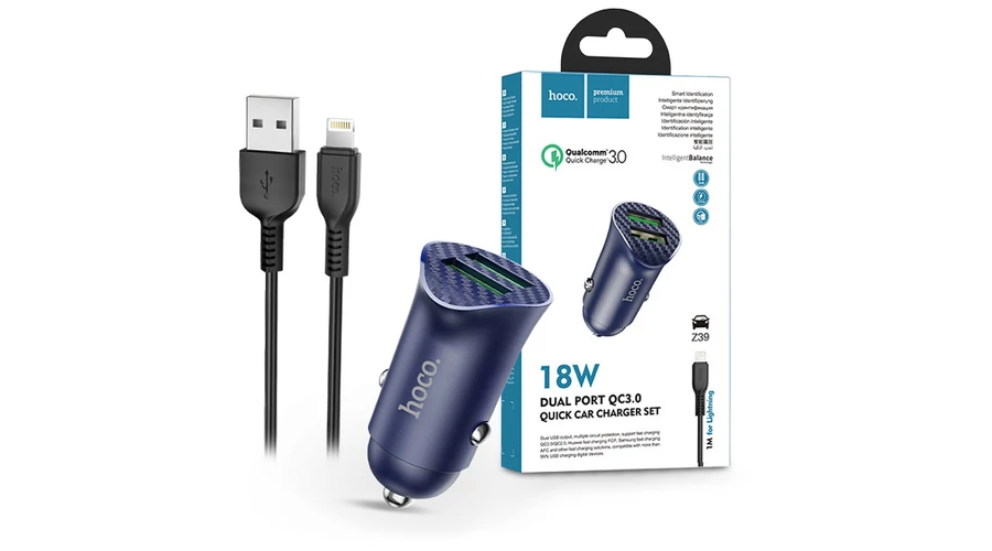 | HOCO 2xUSB szivargyújtós töltő adapter + lightning adatkábel - 5V/3.0A - HOCO Z39 QC3.0 - kék | |