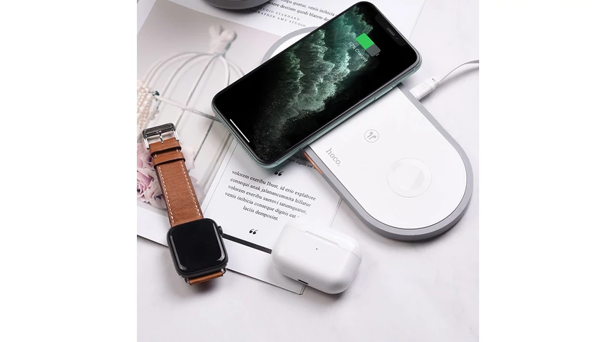 HOCO Qi univerzális vezeték nélküli töltő állomás - 10W - HOCO CW24 Wireless Fast Charger 3in1 - Qi eszköz/Apple iWatch/TWS Airpods - fehér