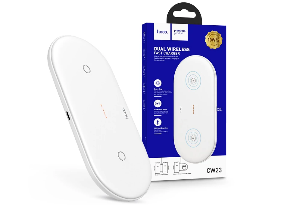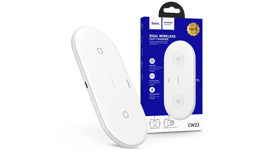 | HOCO Qi univerzális vezeték nélküli töltő állomás - 5V/3A - HOCO CW23 Dual 2in1 Wireless Charger - fehér - Qi szabványos | |