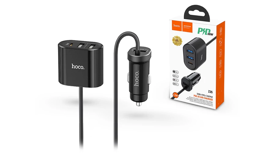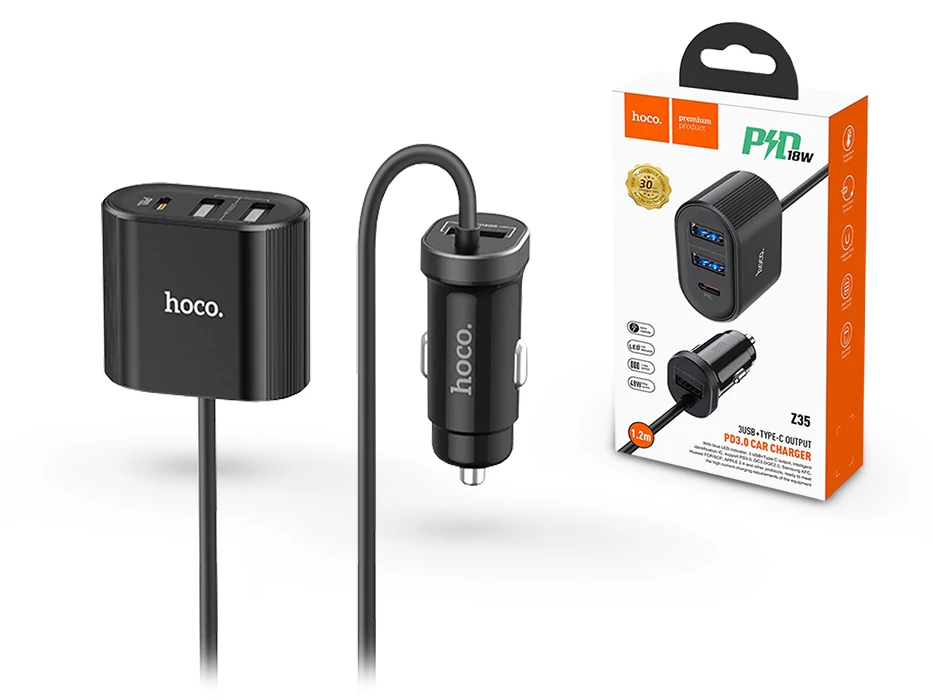 | HOCO szivargyújtó töltő + USB elosztó HUB 3xUSB + Type-C csatlakozóval, 1,2 m-es vezetékkel - PD3.0/QC3.0/QC2.0 - 42W - HOCO Z35 - fekete | |