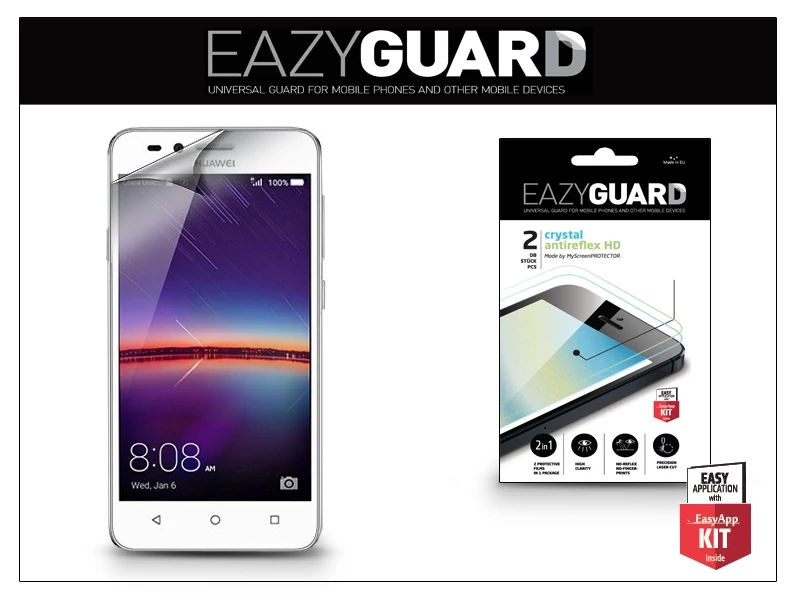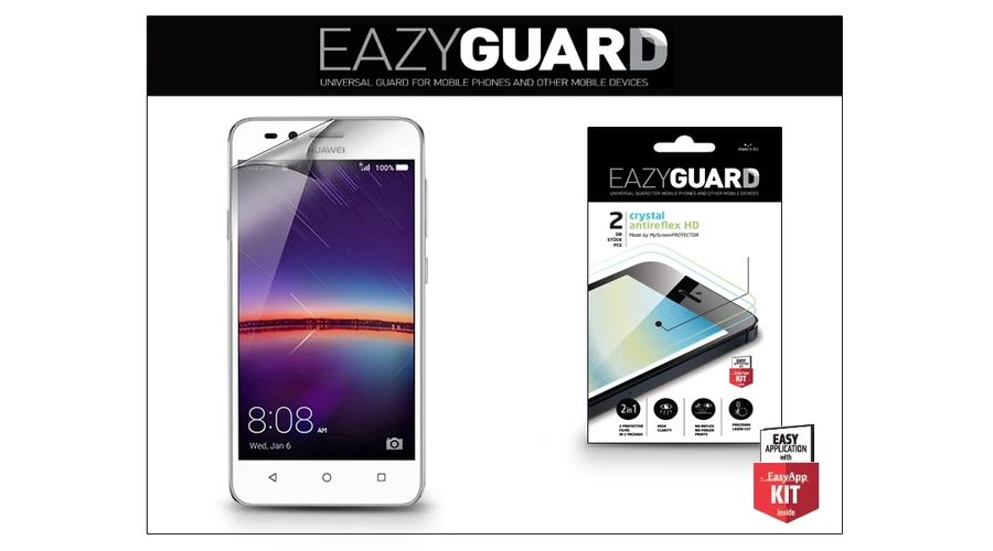 * törlőkendő, EasyApp KIT a könnyű felhelyezéshez, segédeszköz a felsimításhoz, lehúzók (ragasztócsíkok a leválasztandó réteg megfogásához), használati utasítás