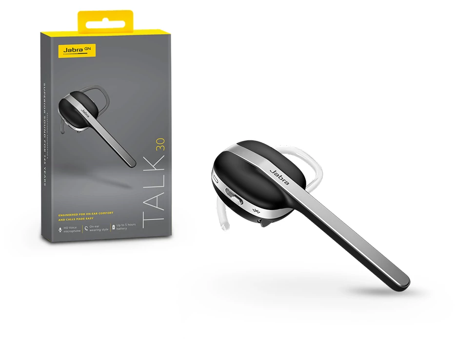 - A csomag tartalma: 1 Jabra Talk 30 fülhallgató, 2 Eargel (egy előre szerelt standard eargel), 1 fülhorog, 1 USB töltőkábel, gyors útmutató, figyelmeztető és jótállási tájékoztatók