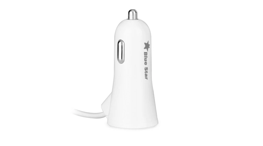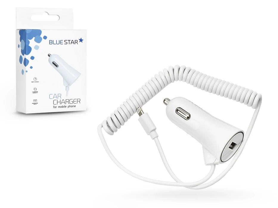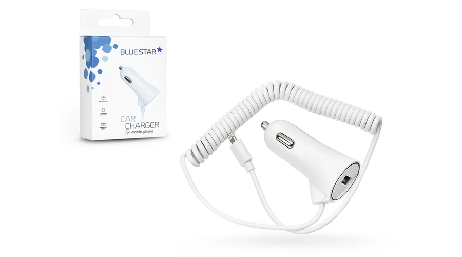 Lightning szivargyújtós gyorstöltő spirál kábellel + USB bemenettel - 5V/3A - fehér