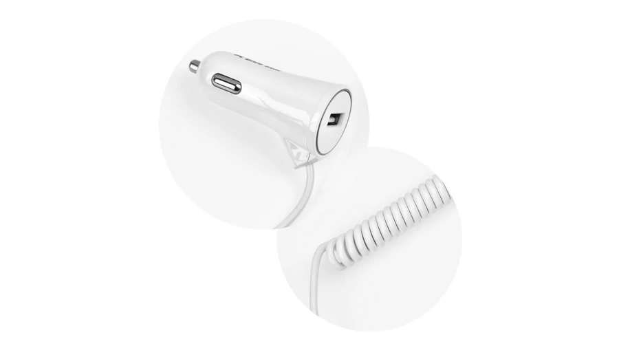 | Lightning szivargyújtós gyorstöltő spirál kábellel + USB bemenettel - 5V/3A - fehér | |