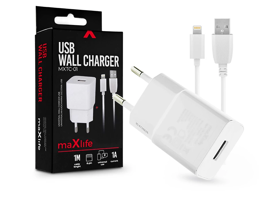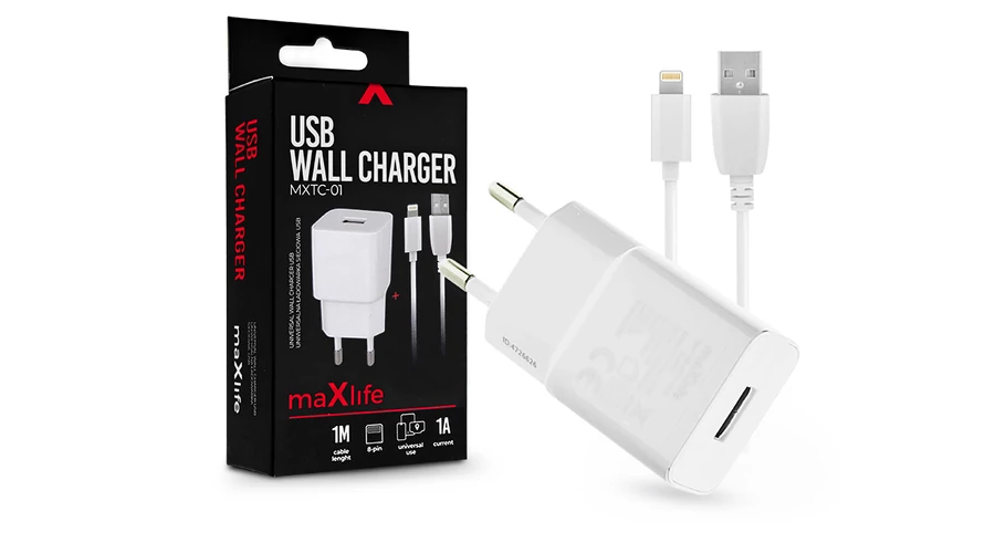 Maxlife USB hálózati töltő adapter + lightning adatkábel 1 m-es vezetékkel - Maxlife MXTC-01 USB Wall Charger - 5V/1A - fehér