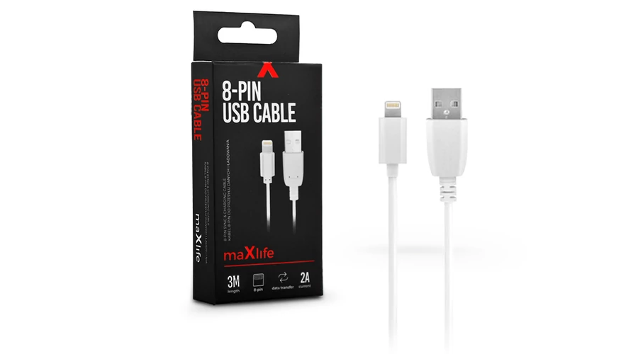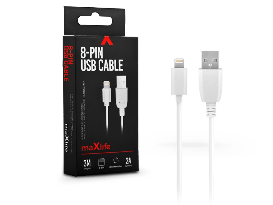 Maxlife USB - Lightning adat- és töltőkábel 3 m-es vezetékkel - Maxlife 8-PIN USB Cable - 5V/2A - fehér