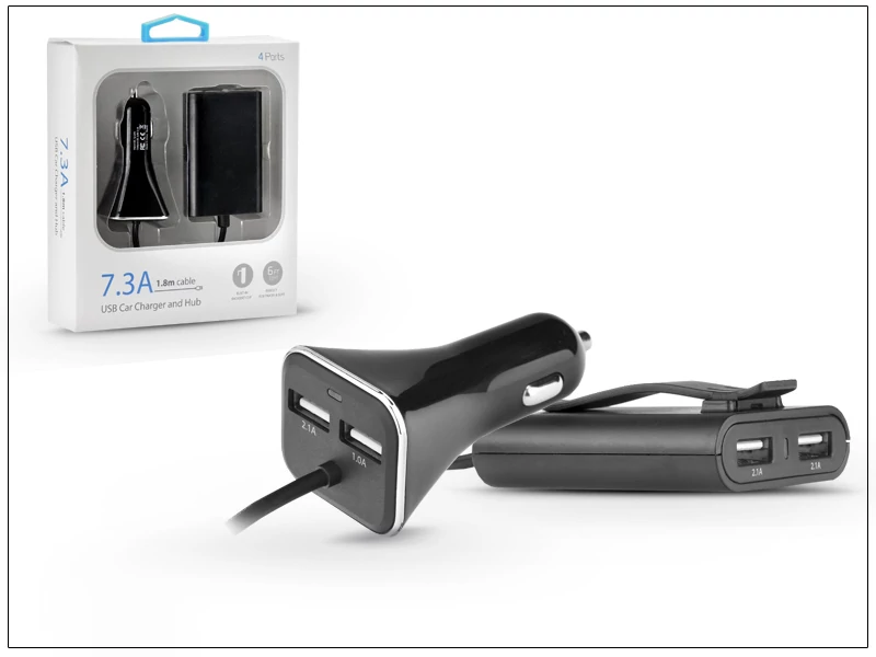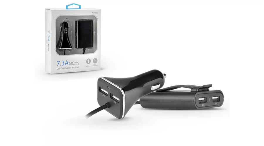 | Szivargyújtó töltő + USB elosztó HUB 4xUSB csatlakozóval, 1,8 m-es vezetékkel - 5V/7.3A - black | |