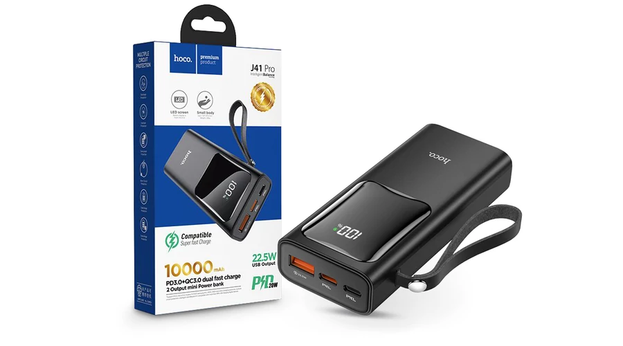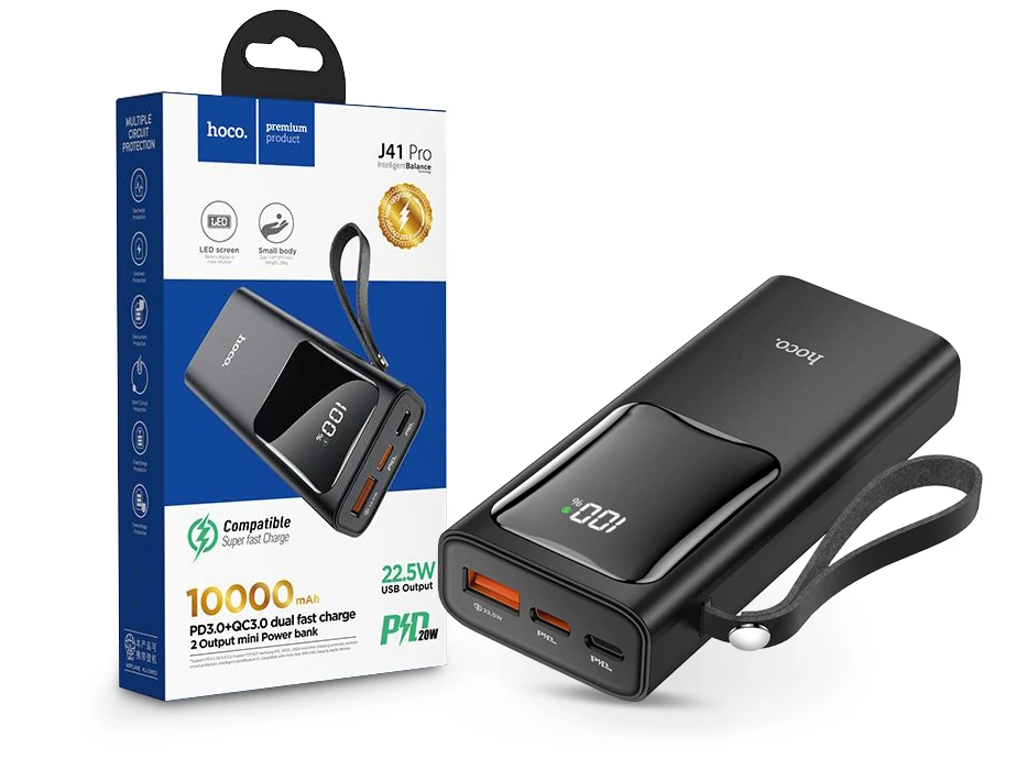 Univerzális hordozható, asztali akkumulátor töltő - HOCO J41 Pro Power Bank - USB+Type-C + Lightning + PD3.0+QC3.0 - 10.000 mAh - fekete