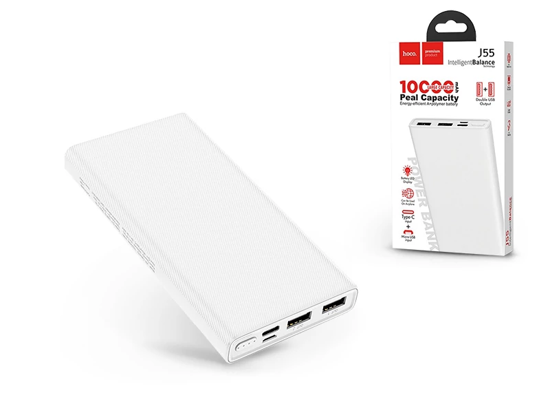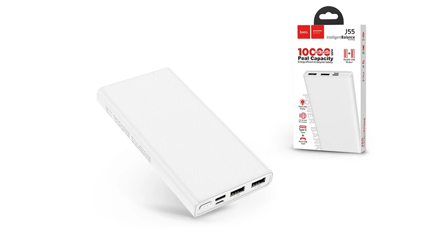 | Univerzális hordozható, asztali akkumulátor töltő - HOCO J55 Power Bank - 2xUSB+microUSB+Type-C - 10.000 mAh - fehér | |