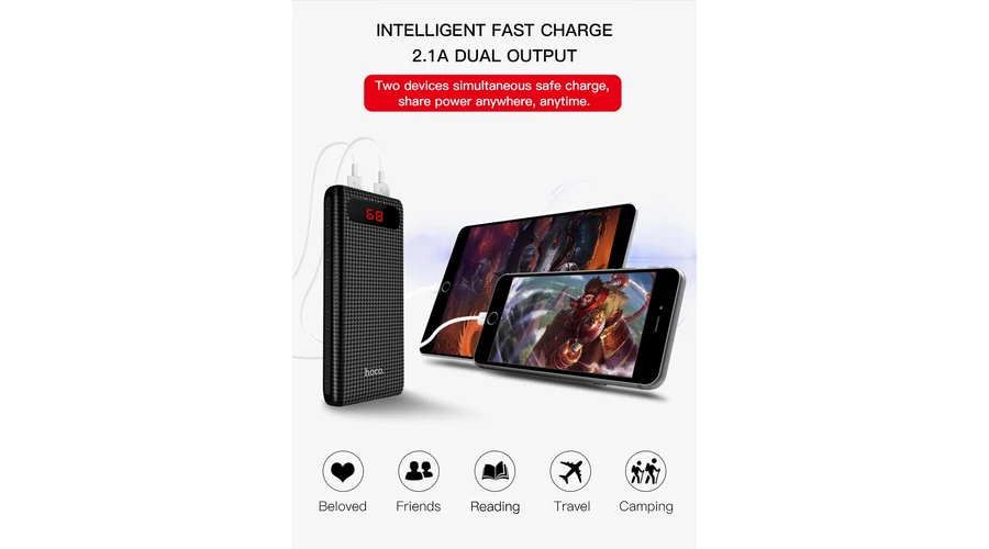 A nagy, 20.000 mAh kapacitás lehetővé teszi okostelefonjának vagy táblagépének többszöri újratöltését, rendkívül hasznosvá teszi a készüléket utazáskor vagy hosszabb áramkimaradások esetén. Ezenkívül két USB port alkalmas két eszköz egyidejű töltésére.
