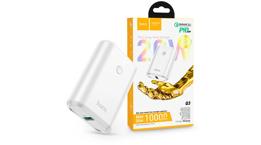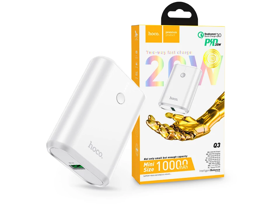 Univerzális hordozható, asztali akkumulátor töltő - HOCO Q3 Power Bank - USB+Type-C+PD3.0+QC3.0 - 10.000 mAh - fehér
