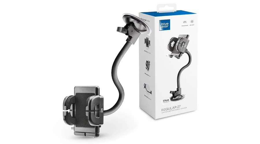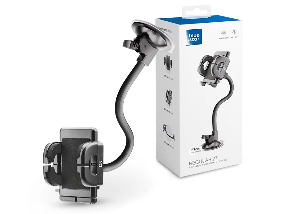 - A BlueStar Premium REGULAR 27 cm-es autós tartó nagyon hosszú és rugalmas karral rendelkezik, így a fogantyú különböző dőlésszögben állítható.