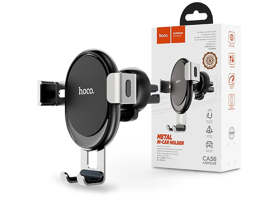 | Univerzális szellőzőrácsba illeszthető PDA/GSM autós tartó 3,5-6" méretű készülékekhez - HOCO CA56 Metal In-Car Holder - fekete/ezüst | |