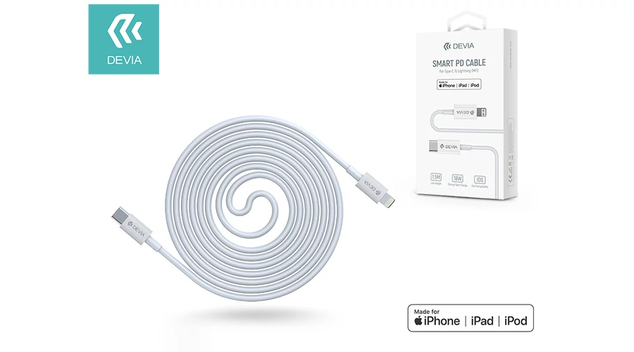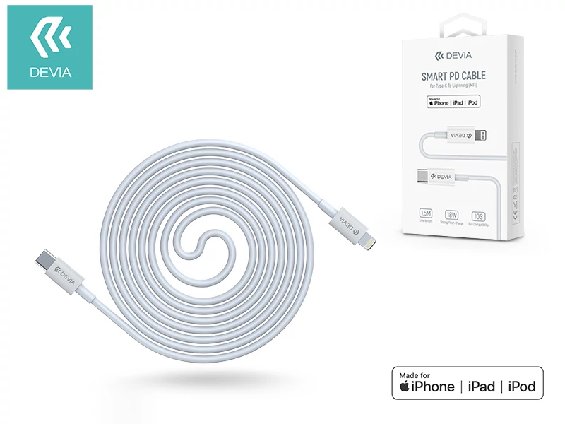 USB Type-C - Lightning adat- és töltőkábel 1,5 m-es vezetékkel - Devia Smart Series PD Cable 18W Type-C to Lightning - white (MFI engedélyes)