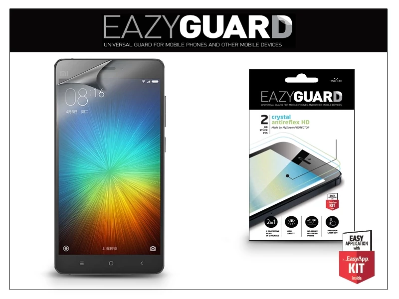 * törlőkendő, EasyApp KIT a könnyű felhelyezéshez, segédeszköz a felsimításhoz, lehúzók (ragasztócsíkok a leválasztandó réteg megfogásához), használati utasítás